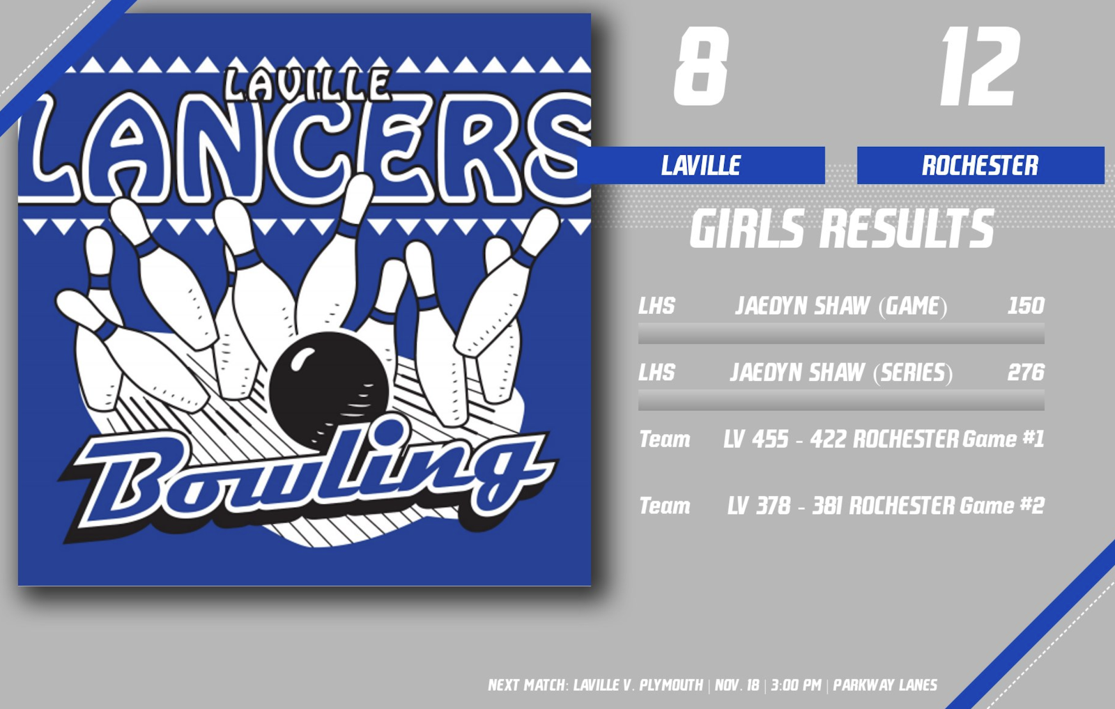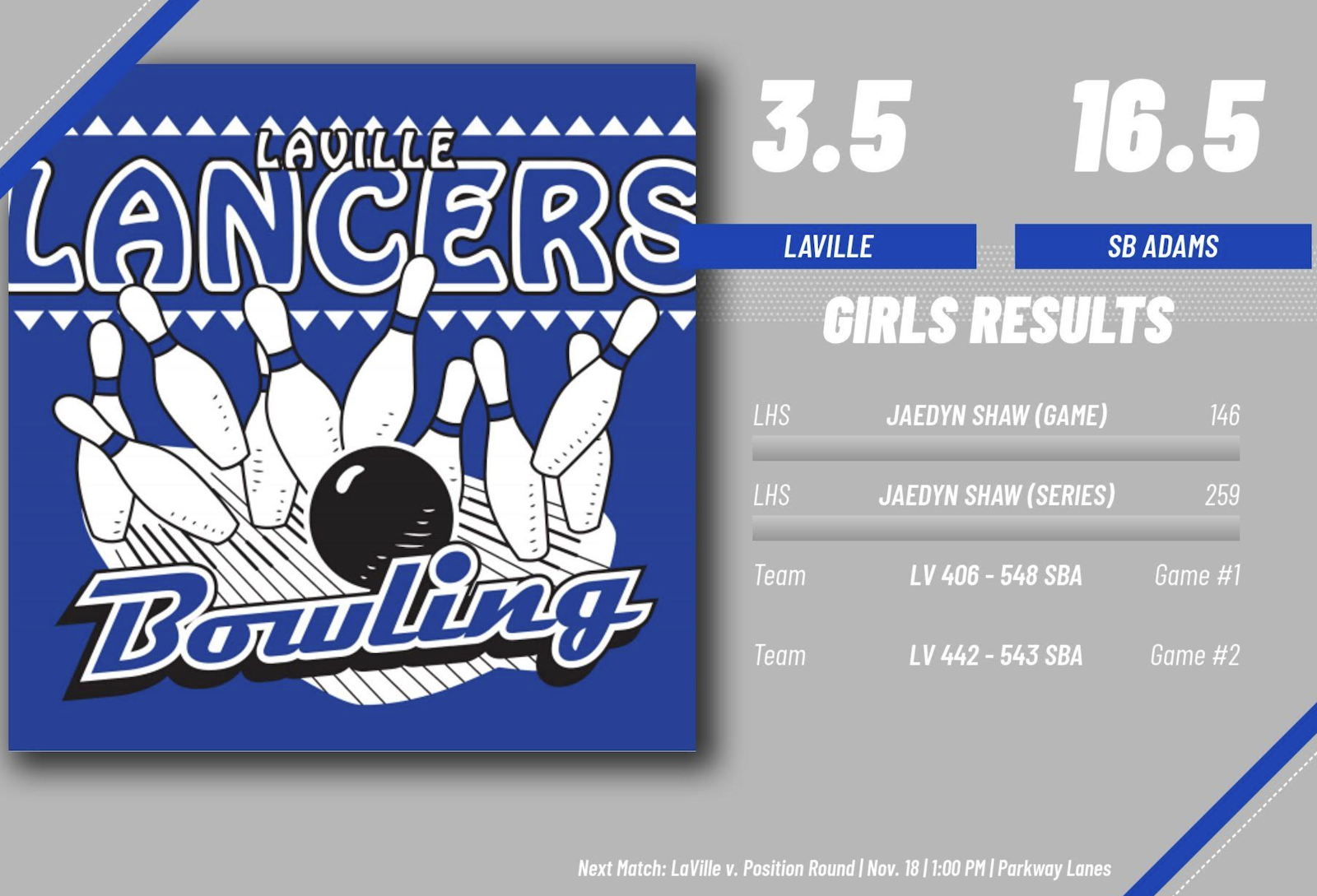SOUTH BEND - The LaVille girls bowling team faced off against South Bend Adams and Rochester in a doubleheader at Chippewa. Jaedyn Shaw and Brooklyn Smith led the Lancers against the Eagles in the opener. Shaw and Smith picked up individual points by defeating their respective opponents and helped the Lancers defeat the Zebras in game one. In the second match, Shaw and Allison Easterday helped the Lancers pick up a 33-pin team victory in the first game. Shaw and Easterday finished more than 20 pins above their average as the Lancers totaled 455 pins against Rochester. In the second game, the two teams battled back and forth, only for the final outcome to be decided by just three pins. The Zebras won, 381-378 in the second game and took the final overall score, 12-8. LaVille will return to action on November 11 at Parkway Lanes. The Lancers will open play with a positional round to open, then meet Plymouth in the 3 p.m. match.